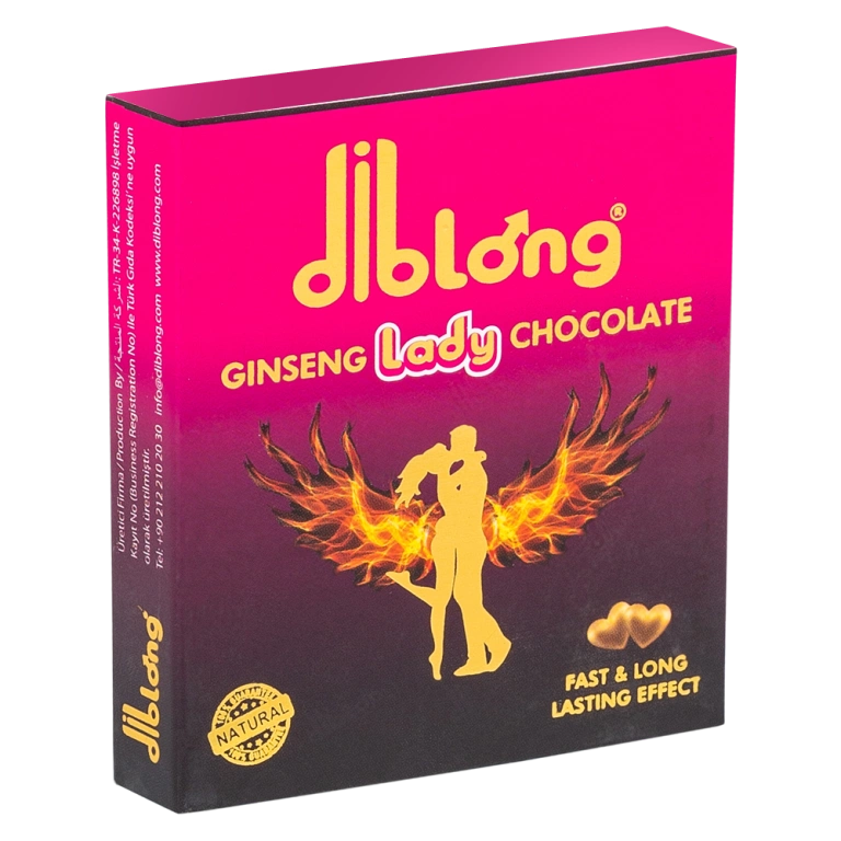 Diblong Lady Çikolata, ginseng özlü bir atıştırmalıktır. 16 gram özel tasarım ve cep boy kutularda satışa sunulmaktadır. Diblong Lady Çikolata'nın içeriğinde maca kökü ve ginseng gibi bileşenler bulunmaktadır. Bu içerikler, partnerinizle unutulmaz anlar geçirmenize yardımcı olur.